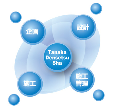 田中電設社は近畿一円を範囲として、主に商業施設を中心とした電気設備工事などを手がけています。 企画・設計から施工まで、明るい社会づくりに貢献すべく活動しています。